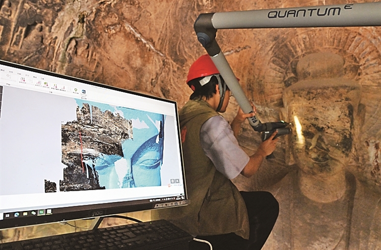 河南洛阳龙门石窟,科研东说念主员用要害臂扫描仪扫描数据。新华社发