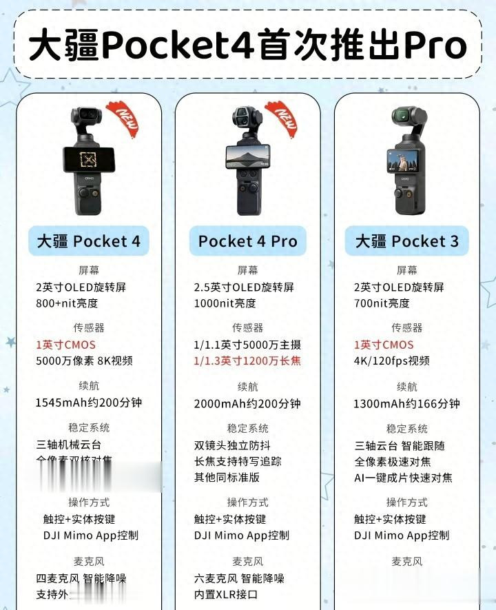 2026年奢华级影像诱导市集迎来了一次备受耀眼的居品迭代。著名科技企业大疆瞻望发布了其备受期待的全新一代口袋相机大疆Pocket 4。这款新品最引东说念主详实的变化在于初度引入了Pro版块。这一举措象征着该居品线崇拜迈入了细分市集的竞争行列。通过推出Pro版块大疆旨在为专科创作家和重度影像疼爱者提供更宏大的硬件设立和更丰富的创作功能。这次发布的Pocket 4和Pocket 4 Pro在屏幕显现。影像传感器。续航才调以及认知系统等多个中枢维度齐终领悟显赫的擢升。这些升级将为用户带来前所未有的挪动影像创作体验。进一步巩固了大疆在便携式云台相机界限的诱骗地位。