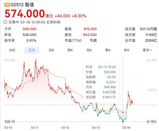 当天港股开盘,智谱公司股价大涨15%,箝制10:39分,股价涨8.3%。在此之前,智谱公司股价已连跌多日,最大跌幅一度超50%。